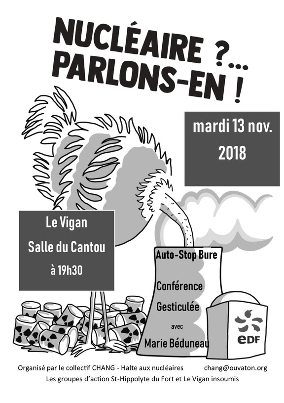 Cette soirée est proposée par le Collectif Halte Aux Nucléaires Gard (CHANG) et les groupes d'action de Saintt-Hippolyte-du-Fort et Le Vigan Insoumis