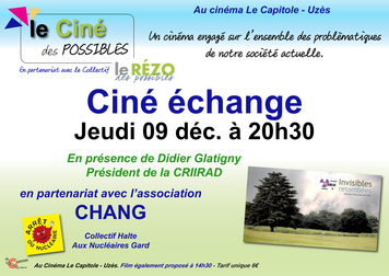 le Ciné des POSSIBLES d'Uzès, un cinéma engagé sur l'ensemble des problématiques de notre société actuelle propose un Ciné échange jeudi 9 décembre à 20h30, en partenariat avec le Collectif Halte aux Nucléaires Gard, au cinéma Le Capitole - Uzès "Invisibles Retombées".