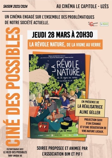 L'association Bim et Pif ! est constituée de vignerons, distillateurs et franc-buveurs uzégeois de vins naturels. Animés par le désir de faire connaître et promouvoir les vins issus de la méthode dite nature, ses membres proposent la projection du documentaire