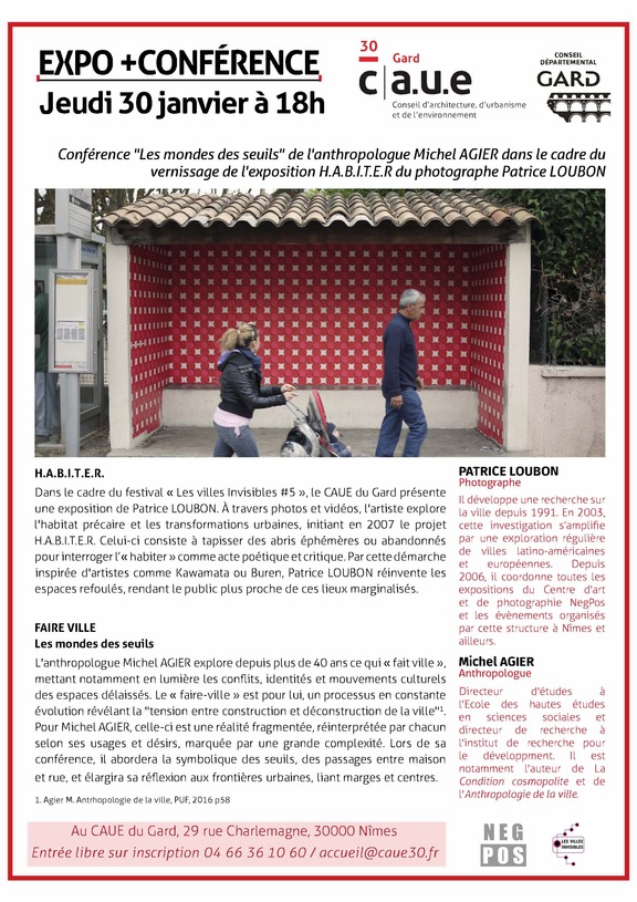 Dans le cadre du festival « Les villes Invisibles #5 », le CAUE du Gard présente une exposition de Patrice LOUBON. À travers photos et vidéos, l'artiste explore l'habitat précaire et les transformations urbaines, initiant en 2007 le projet H.A.B.I.T.E.R. Celui-ci consiste à tapisser des abris éphémères ou abandonnés pour interroger l' « habiter » comme acte poétique et critique. Par cette démarche inspirée d'artistes comme Kawamata ou Buren, Patrice LOUBON réinvente les espaces refoulés, rendant le public plus proche de ces lieux marginalisés.