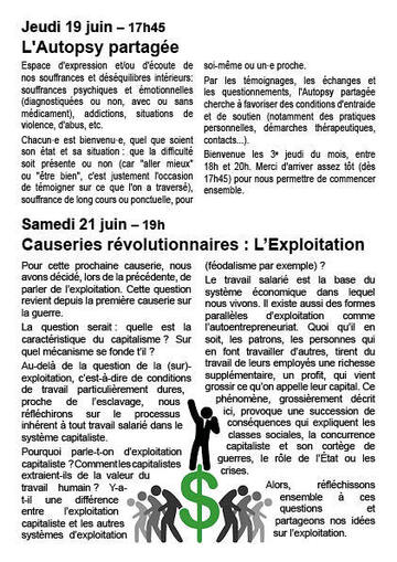Bienvenue les 3e jeudi du mois, entre 18 h et 20 h. Merci d'arriver assez tôt (dès 17 h 45) pour nous permettre de commencer ensemble.