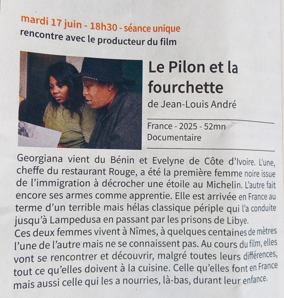 Dans ce film, vous assisterez à la rencontre culinaire entre Evelyne, jeune majeure ivoirienne apprentie en cuisine, arrivée mineure à Nîmes, orientée par RESF et Giorgiana Viou, venue du Bénin, cheffe étoilée Michelin à Nîmes .