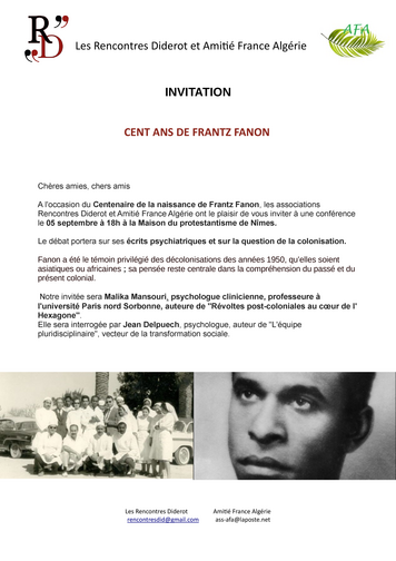 A l'occasion du Centenaire de la naissance de Frantz Fanon, les associations Rencontres Diderot et Amitié France Algérie ont le plaisir de vous inviter à une conférence le 05 septembre à 18h à la Maison du protestantisme de Nîmes.