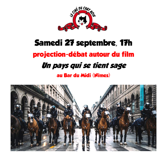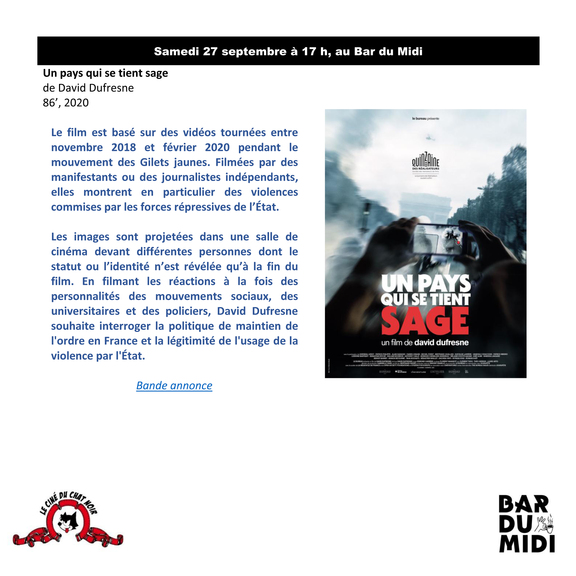 La prochaine projection - débat du Ciné du Chat noir sera consacrée au film Un pays qui se tient sage de David Dufresne. Rendez-vous au Bar du Midi ce samedi 27 septembre à 17 h !