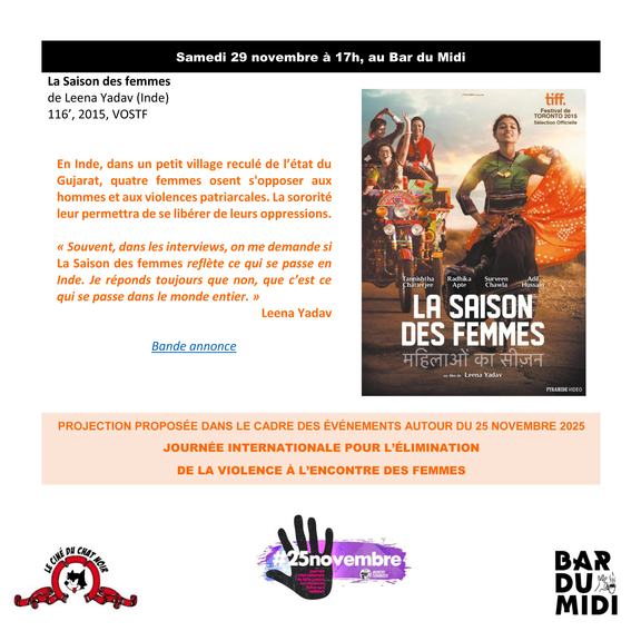 Dans le cadre des événements en lien avec la Journée internationale contre les violences faites aux femmes (25 novembre), le Ciné du Chat noir vous invite à une projection-débat autour du film 'La Saison des femmes' de la réalisatrice indienne Leena Yadav. La séance aura lieu au Bar du Midi le samedi 29 novembre à 17 h. Vous trouverez une brève description du film en pièce jointe et la bande annonce ici : https://www.dailymotion.com/video/x81acsj